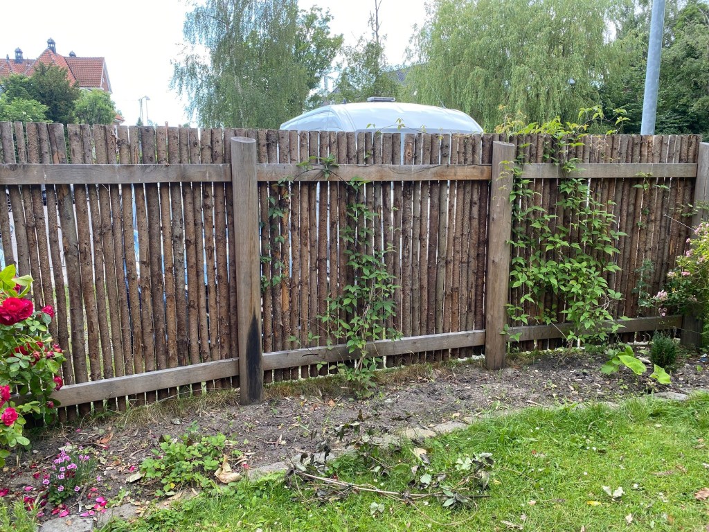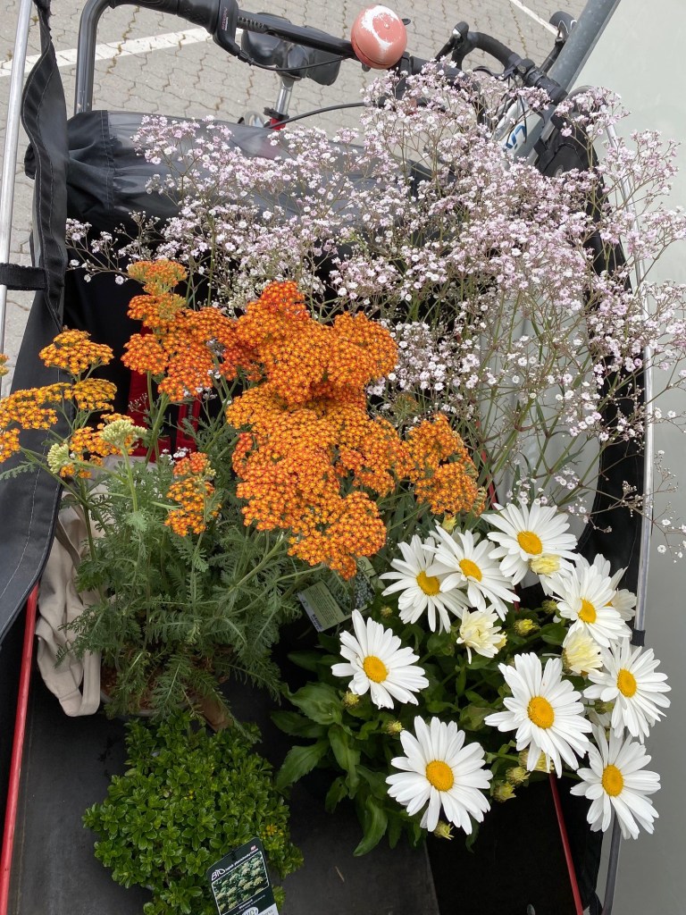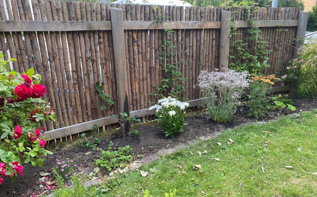 Viceværten i Grønnehavegaard havde været flittig. Ingen ukrudt var tilbage. Til at starte med syntes jeg at det så rigtig tomt og kedeligt ud. Så købte vi blomster. Der blev plantet 5 planter. Det var kæmpemarguerit, brudeslør, røllike, stenurt og et figentræ som vi havde i forvejen.